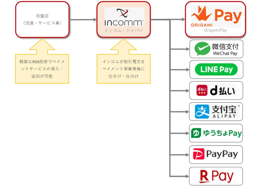 この度、インコム・ジャパンは「Origami Pay」をラインナップに加え、全8種のQR/バーコード決済サービスの提供を開始いたします。インコム・ジャパンが加盟店に提供しているQR/バーコード決済のシステムは、新しい決済事業者のサービスの追加が簡単にできるように設計されている上、インコム・ジャパンのシステム上で取引電文をペイメント事業者毎に仕分け・仕向けするため、加盟店はシステム・業務運用を一本化した対応が可能となります。