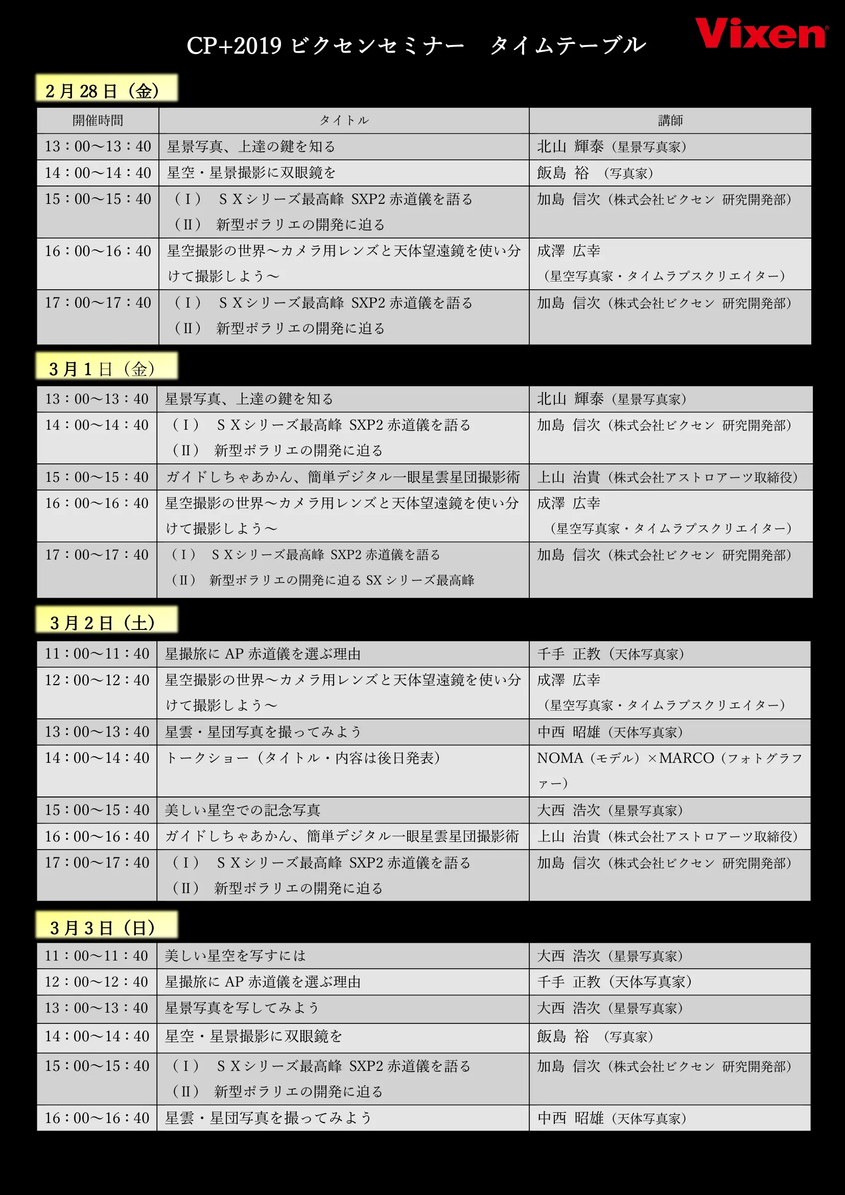 2月28日(木)~3月3日(日)に行われるCP+2019に出展。 トークショー・星空撮影レクチャー・新製品紹介など、 ビクセンブースではさまざまなセミナーを開催します。