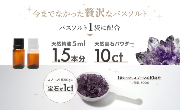 心身共に疲れたときや、嫌なことがあって優れない気分も、宝石のバスソルトが入ったお風呂に入浴すると、まるで魔法がかかったように気分がリセットされ、明日の朝をポジティブな気持ちで迎えることができる。そんなステキなバスタイムをたくさんの方に過ごしていただけたらと思い、この宝石のバスソルトを商品化しました。