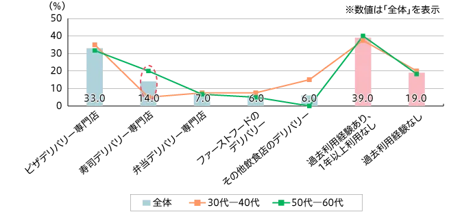年代別に比較して見ると「寿司デリバリー専門店」は50~60代が20%に対し、30~40代が5.0%と15ポイント高くなっています。