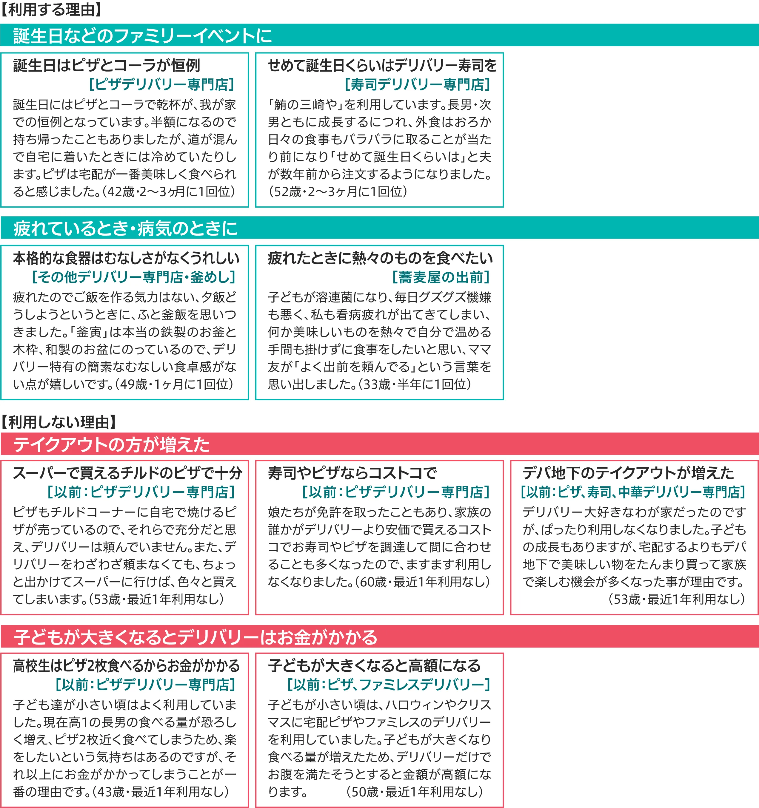 また、デリバリーを「最近1年以上利用なし」「過去利用経験なし」と回答した理由は、「テイクアウトが増えた」が目立ち、中でも「スーパーで買えるチルドのピザで十分」と言った理由も上がっていました。競合する業界のクオリティの向上など企業努力が伺えます。一方でデリバリーサービスを利用したいという気持ちはありながらも、「子どもが大きくなるとお金がかかる」という理由も挙がっています。こうした子供の成長が要因で利用しなくなったケースは、他に「外食できるようになったから」「大勢で集まる機会が減った」といった内容が挙がりました。