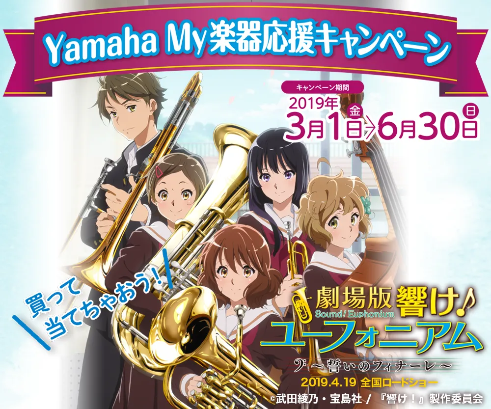 株式会社ヤマハミュージックジャパン(本社:東京都港区、代表取締役社長:押木正人)は、2019年4月19日公開の『劇場版 響け!ユーフォニアム~誓いのフィナーレ~』とタイアップし、ヤマハ、アレキサンダー、モースマン(*1)の管楽器を購入した方に、抽選でアーティストの個人レッスンや『劇場版 響け!ユーフォニアム』の関連グッズなどをプレゼントする「Yamaha My楽器応援キャンペーン」を2019年3月1日(金)から6月30日(日)まで実施します。