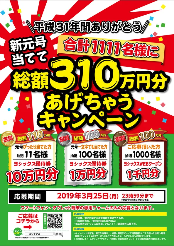 【金賞】10万円のヨシックス優待券:元号を当てた方を対象に抽選で11名様へ