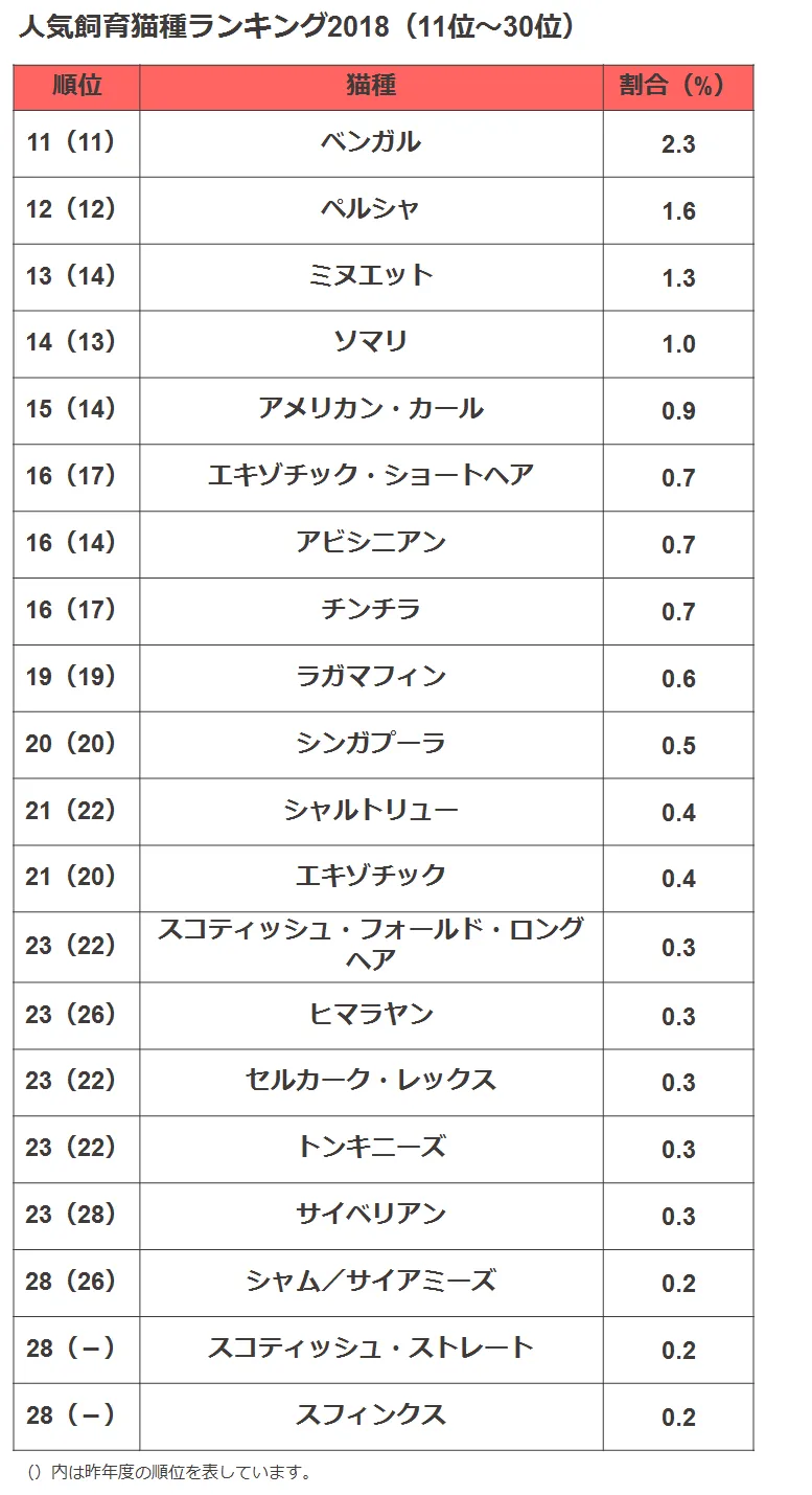 猫部門では、トップ10に引き続き、大型種や長毛種の猫種も多くランクインしました。その他、「スフィンクス」等の珍しい猫種を飼育している方も見られました。
