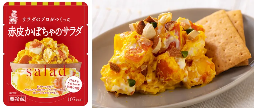 このたび発売する「サラダのプロがつくった 赤皮かぼちゃのサラダ」には、一般的なかぼちゃと比べて青臭さが少なく、皮が薄く柔らかい“赤皮かぼちゃ”を使用。その鮮やかな赤色の皮とオレンジ色の果肉をいかし、食卓を彩る華やかな色合いのサラダに仕上げました。口あたりなめらかで、素材をいかしたやさしい甘味が広がる一品となっています。内容量は1袋80gと食べきりサイズで、そのままでももちろん、ナッツをトッピングしたり、生クリームと合わせてサンドイッチにするなどのアレンジもお楽しみいただけます。