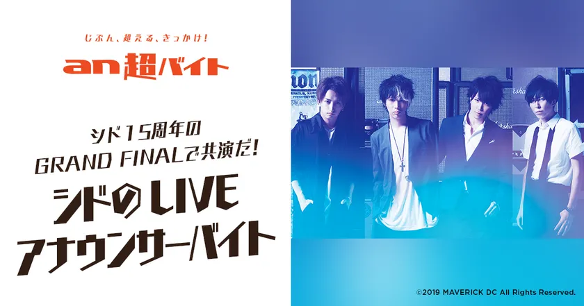 総合人材サービス、パーソルグループのパーソルキャリア株式会社(本社:東京都千代田区、代表取締役社長:峯尾 太郎)が運営するアルバイト求人情報サービス「an」< https://weban.jp/ >は、思わず挑戦してみたくなるような「an超バイト」の新企画として、2019年3月10日に開催される『SID 15th Anniversary GRAND FINAL at 横浜アリーナ ~その未来へ~』にて、ご来場の皆様へのお礼や当日の注意事項等をアナウンスして頂く、“LIVEアナウンサー”バイトを3名募集します!シドと“声”で共演し、記念すべきグランドファイナルを盛り上げて頂きます。