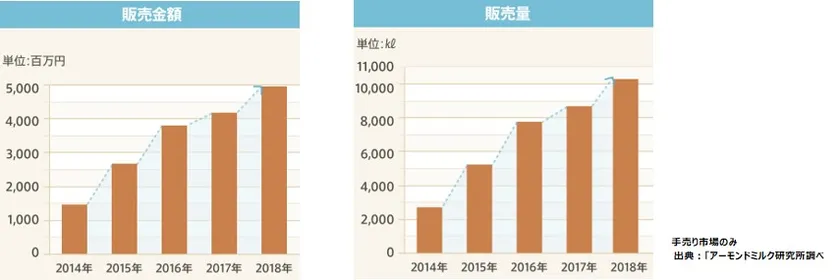 2013年にブルーダイヤモンド「アーモンド・ブリーズ」が上陸し、江崎グリコが「アーモンド効果」を発売して以来、アーモンドミルクは牛乳、豆乳に次ぐ「第3のミルク」として脚光を集め、急速に拡大しました。一時的なブームに終わらず、2018年は、前年比118%の販売額約50億円、販売量1万kl突破しました。
