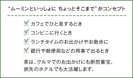 気ままなお散歩に出かけたり、カフェでひと息ついたり…。半径1マイル(1.6km)程度のちょっとしたお出かけに必要なものだけを入れて、サッと出かけられる程よく小ぶりなレザーバッグになったのは、大好きなムーミン。