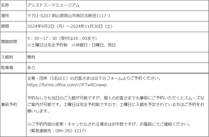 医療用品メーカーのダイヤ工業株式会社(本社:岡山県岡山市 代表取締役:松尾浩紀)は、一般社団法人アシストスーツ協会(所在地:東京都中央区 代表理事:飯田 成晃)の協力のもと、2024年9月2日(月)に、9社のアシストスーツを装着・比較ができる体験型の展示施設「アシストスーツミュージアム」を期間限定でオープンします。入館料は無料でどなたでもご入館いただけます。詳細は下記よりご確認ください。