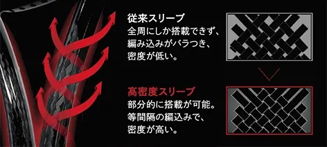 高密度で等間隔に編み込まれたスリーブ(筒状)カーボンをシャフトに搭載。柔軟なねじれと瞬時の復元によって、パワーのあるショットと精密なコントロールを両立させます。
