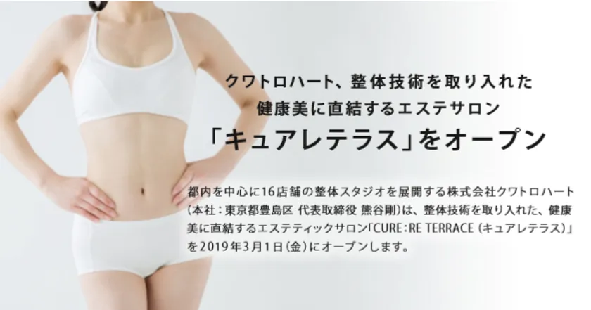 都内を中心に16店舗の整体スタジオを展開する株式会社クワトロハート(本社:東京都豊島区、代表取締役:熊谷 剛)は、整体技術を取り入れた、健康美に直結するエステティックサロン「CURE:RE TERRACE(キュアレテラス)」を、東京・新宿に2019年3月1日(金)オープンします。