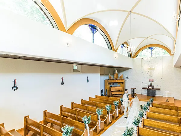 日本では希少なヨーロッパの建築様式である、アーチを連ねたヴォールト天井。天窓から木々がのぞいた開放的な空間にパイプオルガンの深い音色が響き渡り、感動のセレモニーを実現します。