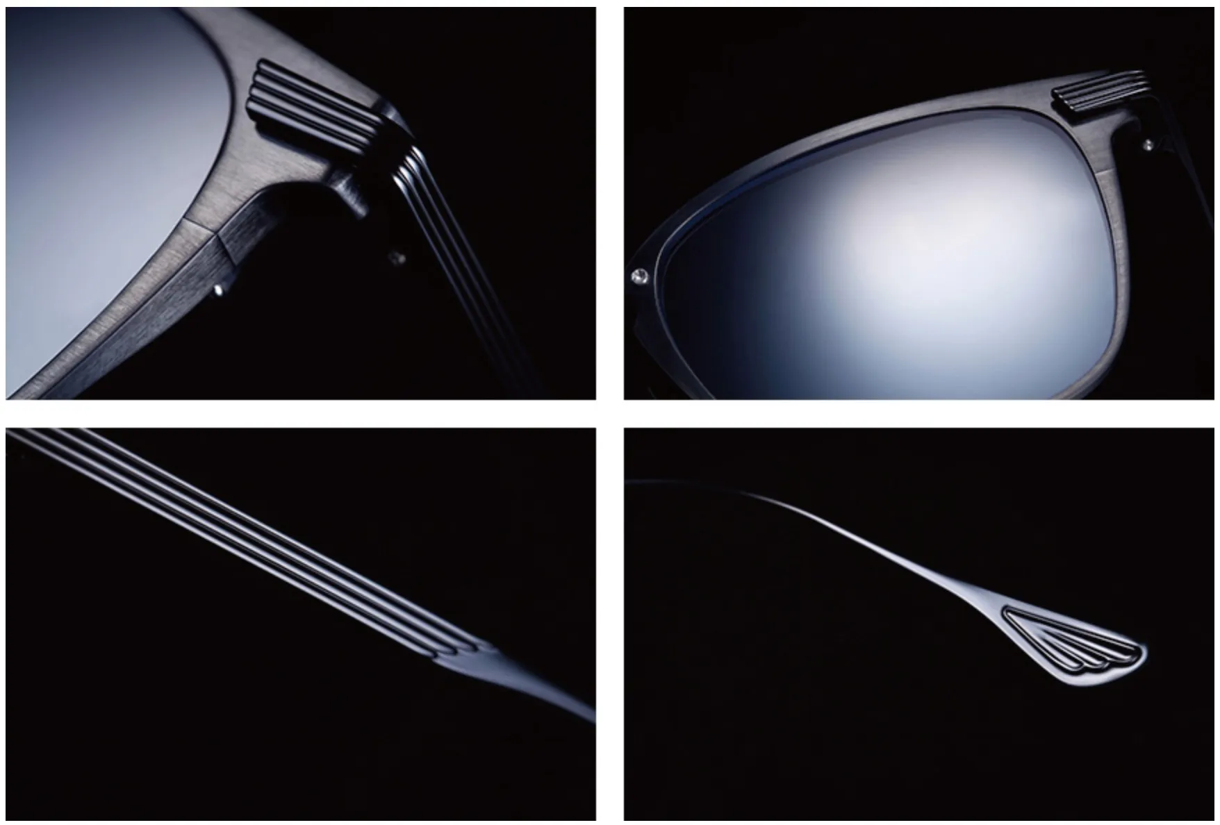 4mm厚のチタンをプレスで抜いたリムに、被せのヨロイは精度高く曲げ加工をしています。テンプルチップは、プラスチックを使わないスタイリッシュなイメージに仕上げました。