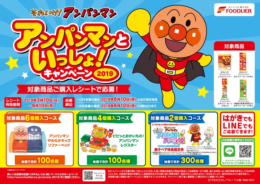 株式会社フードリエ(本社:大阪府高槻市、代表取締役社長:石野 克彦)は、2019年3月10日(日)~6月10日(月)までの期間で、『それいけ!アンパンマン アンパンマンといっしょ!キャンペーン2019』を実施いたします。