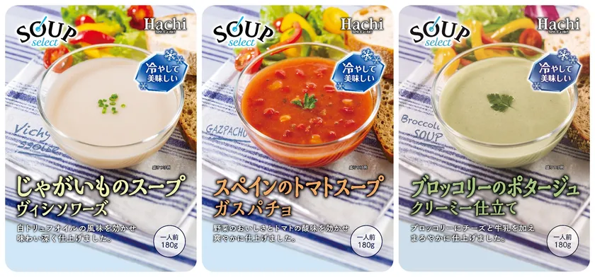 ご好評いただいている『SOUP SELECT(スープセレクト)』シリーズに、「ヴィシソワーズ」、「ガスパチョ」、「ブロッコリーのポタージュ」の冷製スープ3品が仲間入りします。