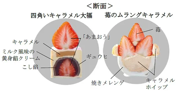 苺「あまおう」を使用した苺大福が入ったケーキや、メレンゲのサックリ食感が楽しい新食感ケーキが登場。