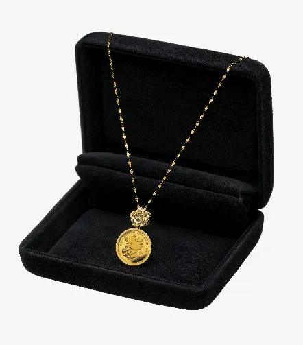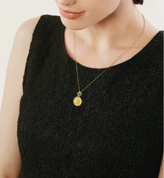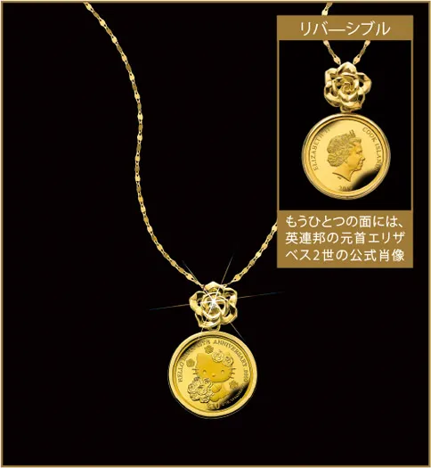 両手いっぱいに薔薇の花束を抱えたハローキティがデザインされた純金の貨幣が、華やかに胸元を彩るコインペンダント。英連邦クック諸島政府から公式に発行される法定貨幣、しかも99.99%以上の純度を誇る本物の金貨を使用した、きわめて貴重で、きわめて贅沢な逸品です。