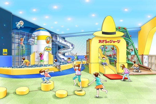 施設内はジョージと仲間たちが登場する『アパート』 『街の大通り』 『カントリー』 『宇宙』と、4つのエリアで分かれており、お子様の成長に合わせて遊びの幅が広がる人気エピソードにちなんだたくさんの遊具が楽しめます。