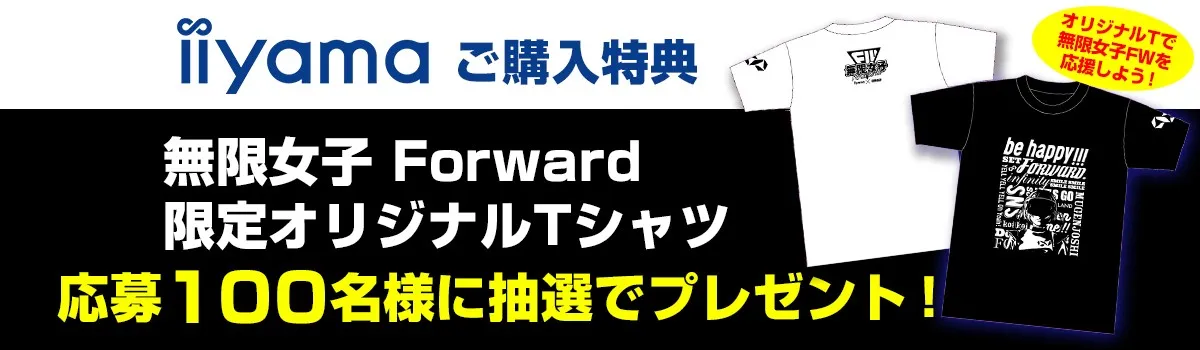 キャンペーン期間中に、店頭またはWebにて 弊社オリジナルパソコン「iiyama PC」をご購入頂き、本サイトにてお申込みいただいたお客様の中から、抽選で100名様に「無限女子Forward オリジナルTシャツ」プレゼント!