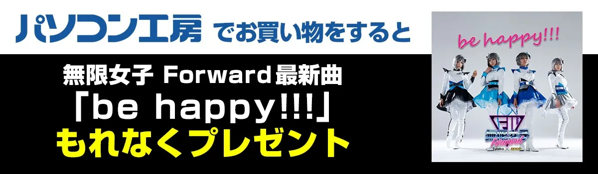パソコン工房でお買い物をして頂くと、新曲「be happy!!!」を無料で「無限女子 Forward」公式サイトにてダウンロードすることができます。是非新曲をゲットしてください!また「無限女子 Forward」が歌う「Shining Road ~楽しいことを全力で!~」もダウンロード頂けます。