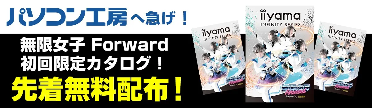 パソコン工房各店舗にて初回限定「無限女子 Forward」の iiyama PC簡易カタログを配布いたします。「無限女子 Forward」メンバーのプロフィールやカタログ限定のカットなども盛り込んだ貴重な限定版となります。是非、全国のパソコン工房 PCコーナーへお越しください。