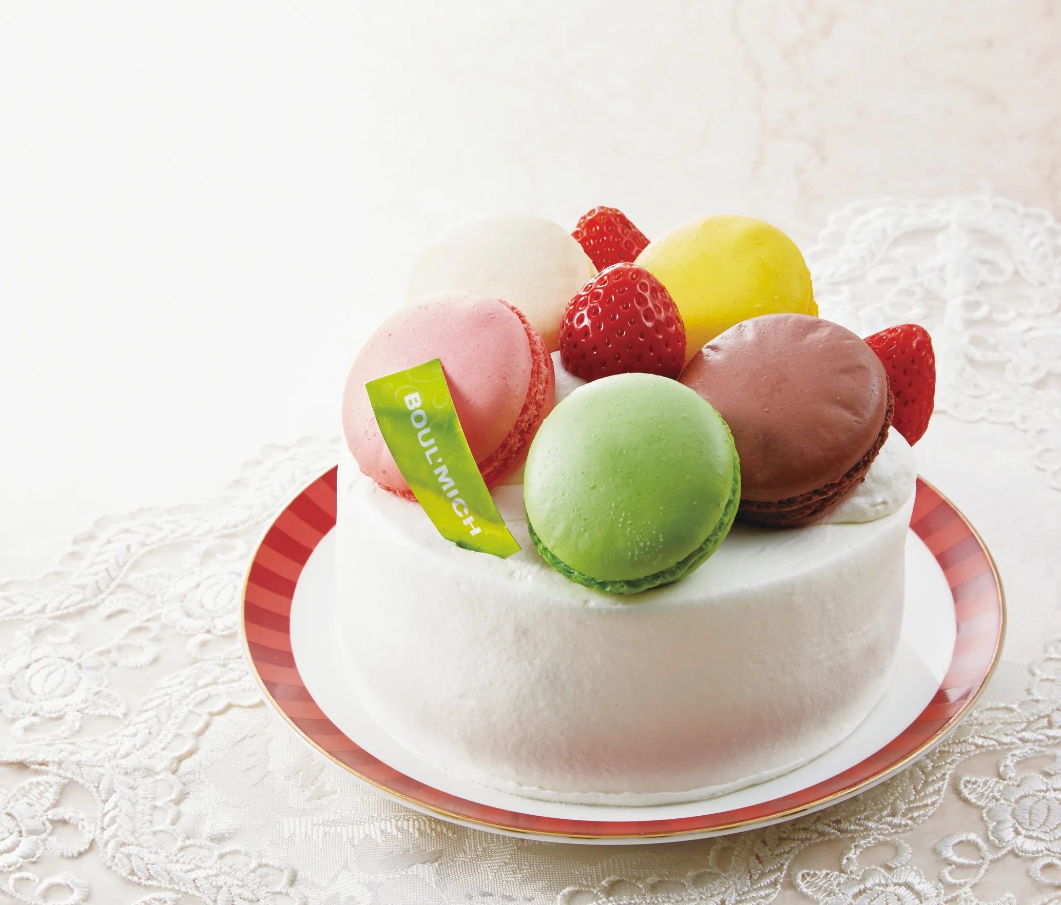5色のマカロンを乗せた可愛らしいケーキ。