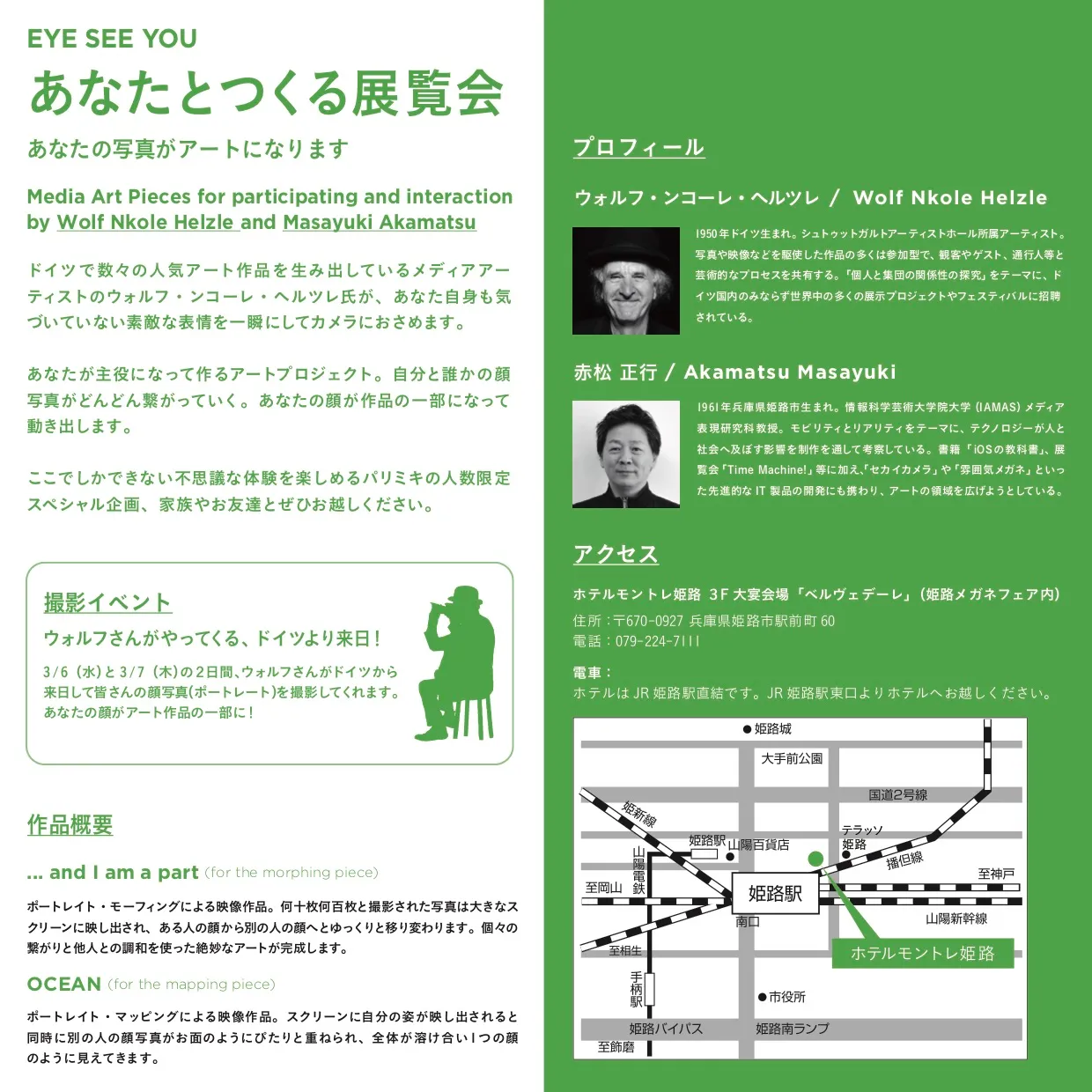 ドイツで数々の人気アート作品を生み出しているメディアアーティストのウォルフ・ンコーレ・ヘルツレ氏が、関西3箇所にて、あなた自身も気づいていない素敵な表情を一瞬にしてカメラにおさめます。