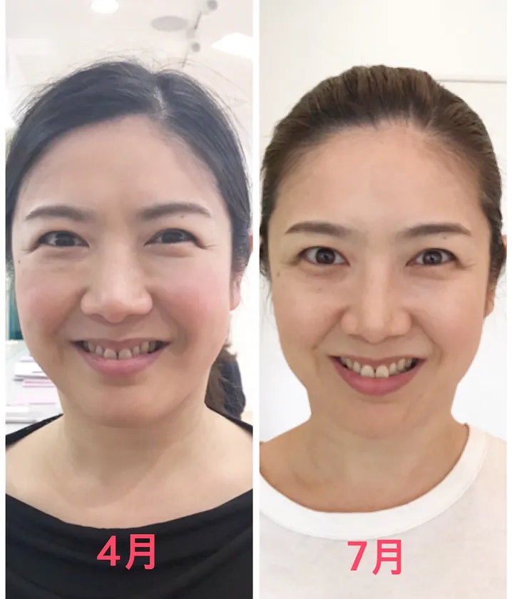 でも、顔ヨガレッスンで左の口角も上がり、スマイルラインが綺麗に変わり、これからも続けたいとお喜びの言葉をいただきました。