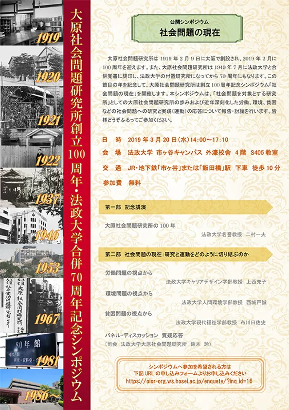 社会労働問題の研究所の草わけ 大原社会問題研究所創立100年・法政大学合併70周年 記念シンポジウム「社会問題の現在」 3月20日(水)市ケ谷キャンパスで開催