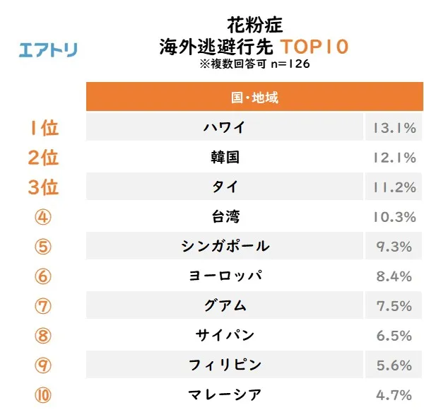 花粉症から逃れるための旅行先を聞いたところ、海外では1位「ハワイ」(13.1%)、2位「韓国」(12.1%)、3位「タイ」(11.2%)という結果となりました。杉やヒノキの少ない東南アジアを中心に、ビーチリゾートが上位を占めています。