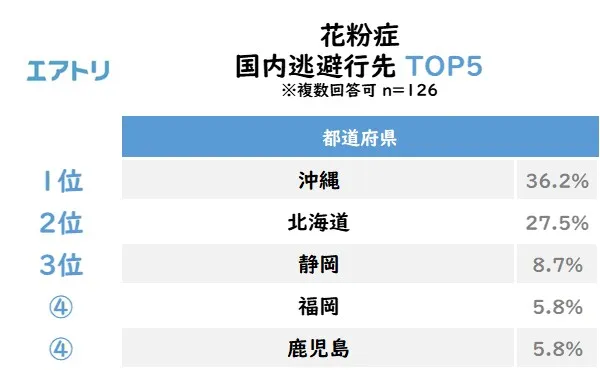 「沖縄」は、杉やヒノキが少ないこと、「北海道」は、本州と花粉が飛散する時期が異なることを理由に、多くの人に「花粉症逃避行先」として選ばれる結果となりました。