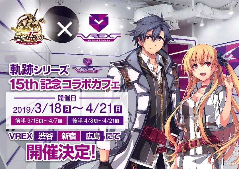 株式会社フタバ図書が運営する、最新のVR(ヴァーチャル・リアリティ/仮想現実)体験と飲食ができるレストラン「VR Game&Cafe Bar VREX(ヴィレックス)」(渋谷、新宿、広島)にて、日本ファルコム株式会社の「軌跡シリーズ」との期間限定コラボカフェを、2019年3月18日(月)~2019年4月21日(日)に開催します。( http://www.vrex.jp/ )
