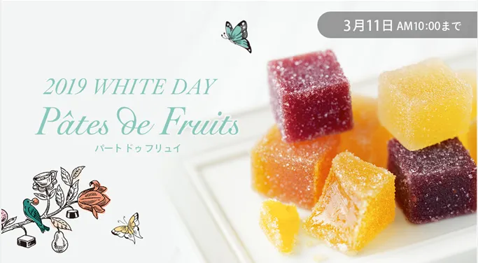 ホワイトデーのおすすめは大好評の「パート ドゥ フリュイ」。もぎたての果実そのもののジューシーな味わいのドゥバイヨルのパート ドゥ フリュイは、紅茶はもちろん、ワインやシャンパンとも相性の良い大人のスイーツ。ホワイトデーのプレゼントにぴったりな春らしい華やかなパッケージも人気です。