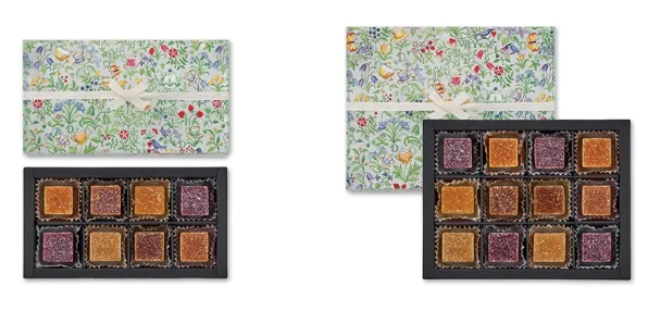 甘みを抑え、やわらかな食感を保ち、上質な果肉をそのままをキューブにしたような濃厚で贅沢な味わいが特長です。華やかなフルーツの甘みと酸味が口いっぱいに広がります。美しいBOXに詰められた宝石のようなスイーツです。