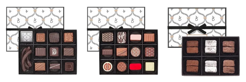 モダンで上品、さらに高級感のある雰囲気はまるで宝石箱。シックな装いでボックスに並ぶショコラひとつひとつをさらに輝かせます。 詰合せの内容は、プラリネ、ガナッシュ、トリュフと様々。お好みに合わせてお選びください。贈る人を選ばない、シンプルを極めた定番のコレクションです。