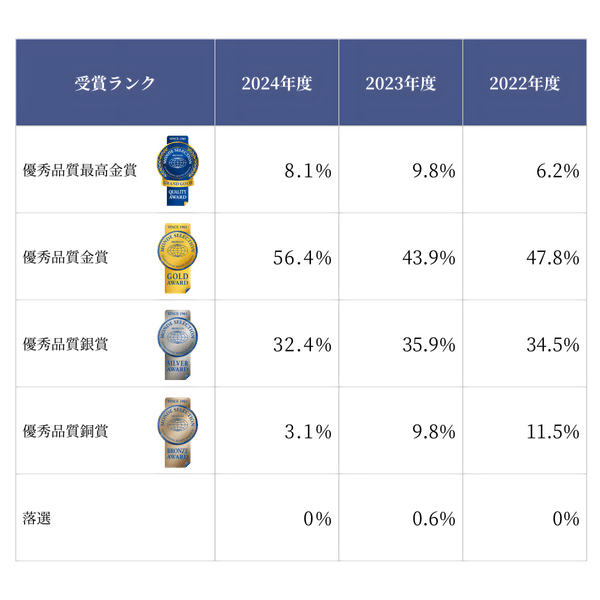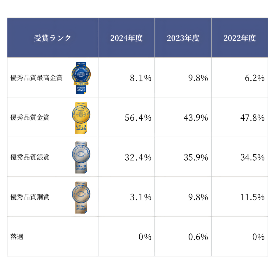 2024年度モンドセレクションにおいて、おかげさまで弊社がお預かりした全ての商品が無事に受賞しました。こちらの結果を踏まえ、過去3年間のランク別受賞比率を以下に報告いたします。