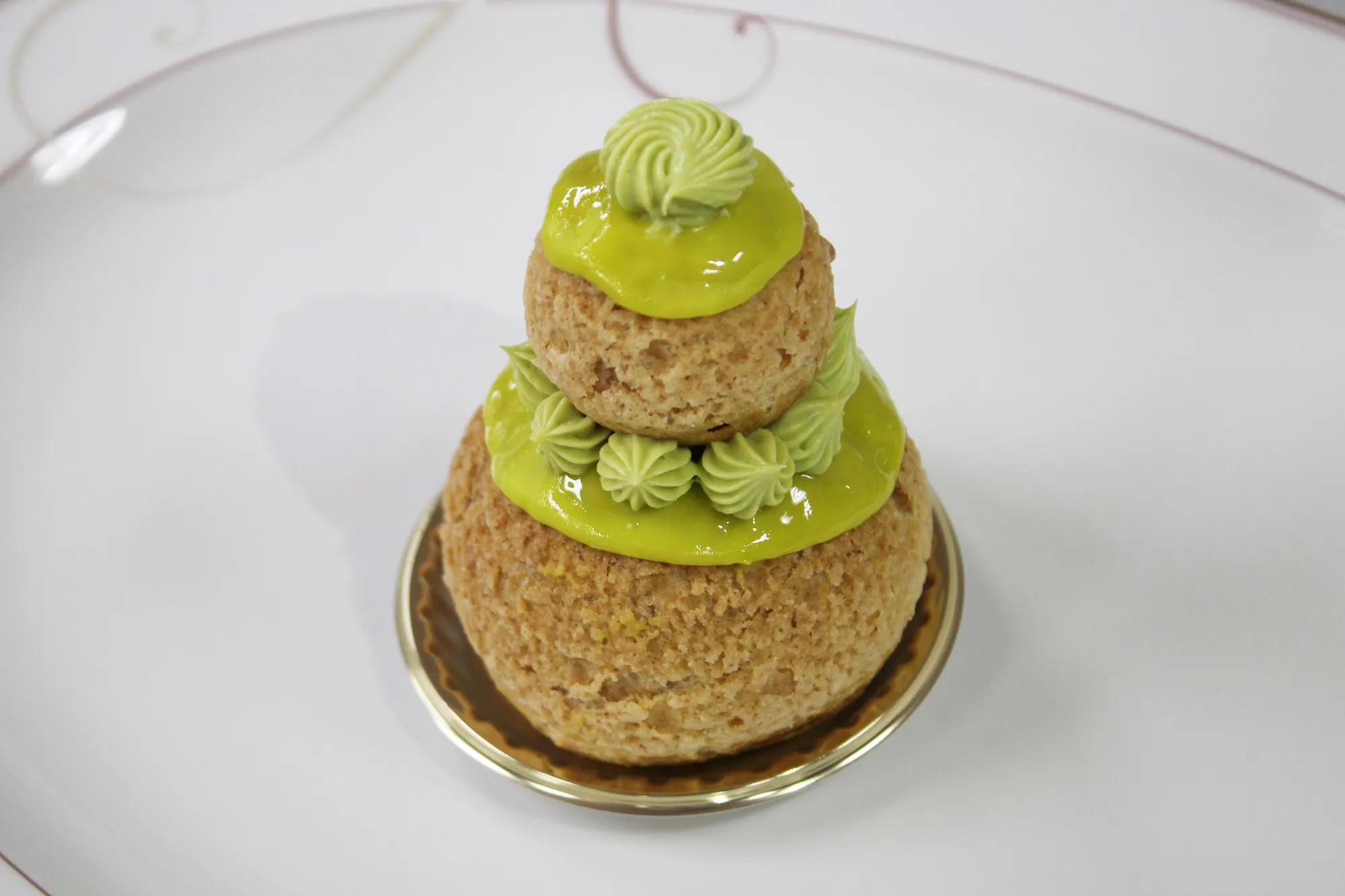 バーバララの姿をイメージしてピスタチオのフォンダンとバタークリームでトッピングしたシューケーキ。上段のシュークリームはピスタチオクリーム入りとピスタチオづくし。下段のシュークリームにはフランボワーズのコンフィチュールが入っており、酸味を利かせています。