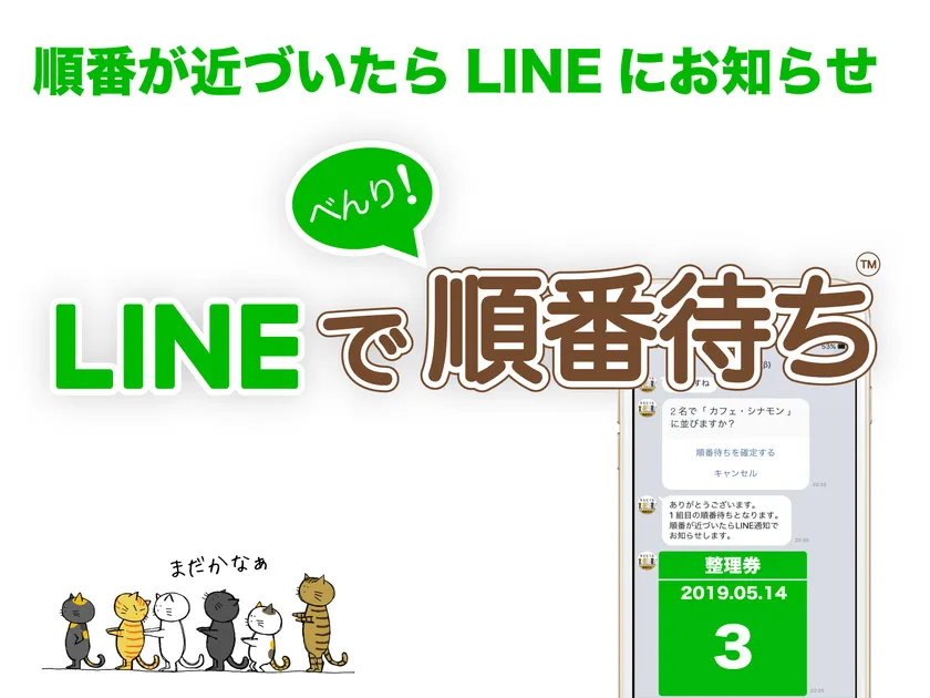 「LINEで順番待ち」とは、LINE上で整理券を取得することができ、店舗に行かなくても順番待ちに並べるサービスとして2017年3月のリリース以来、飲食店や医院・クリニック、催事など全国各地の多種多様な業態へ幅広く導入が進んでいる順番待ちサービスです。