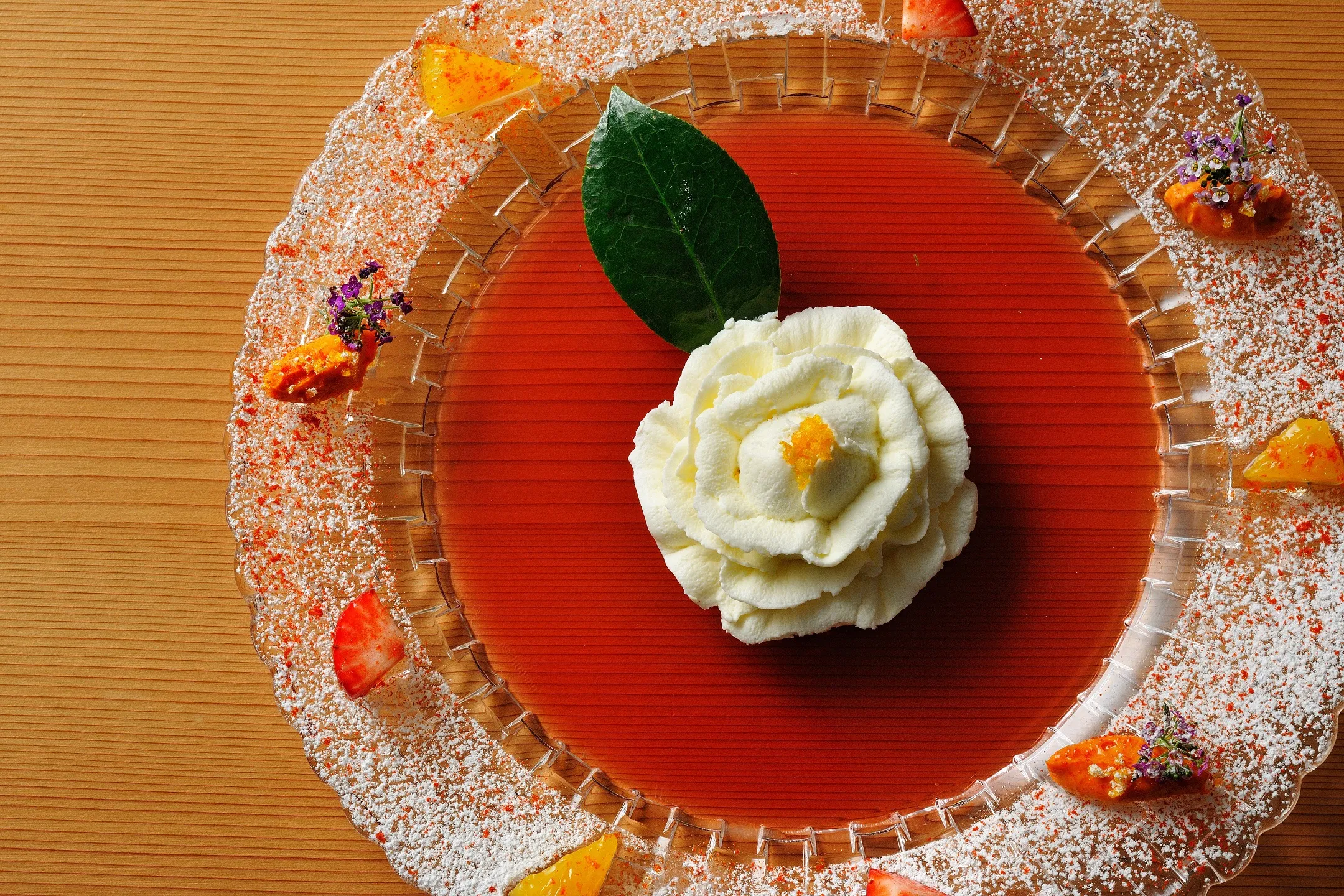 春の特別会席は台の物に、蒸した金目鯛に椿油をかけて仕上げる料理「金目鯛の椿蒸し」を提供します。さらに、椿のワインゼリーを下地に、椿の形を模した見た目にも楽しい甘味も用意しています。