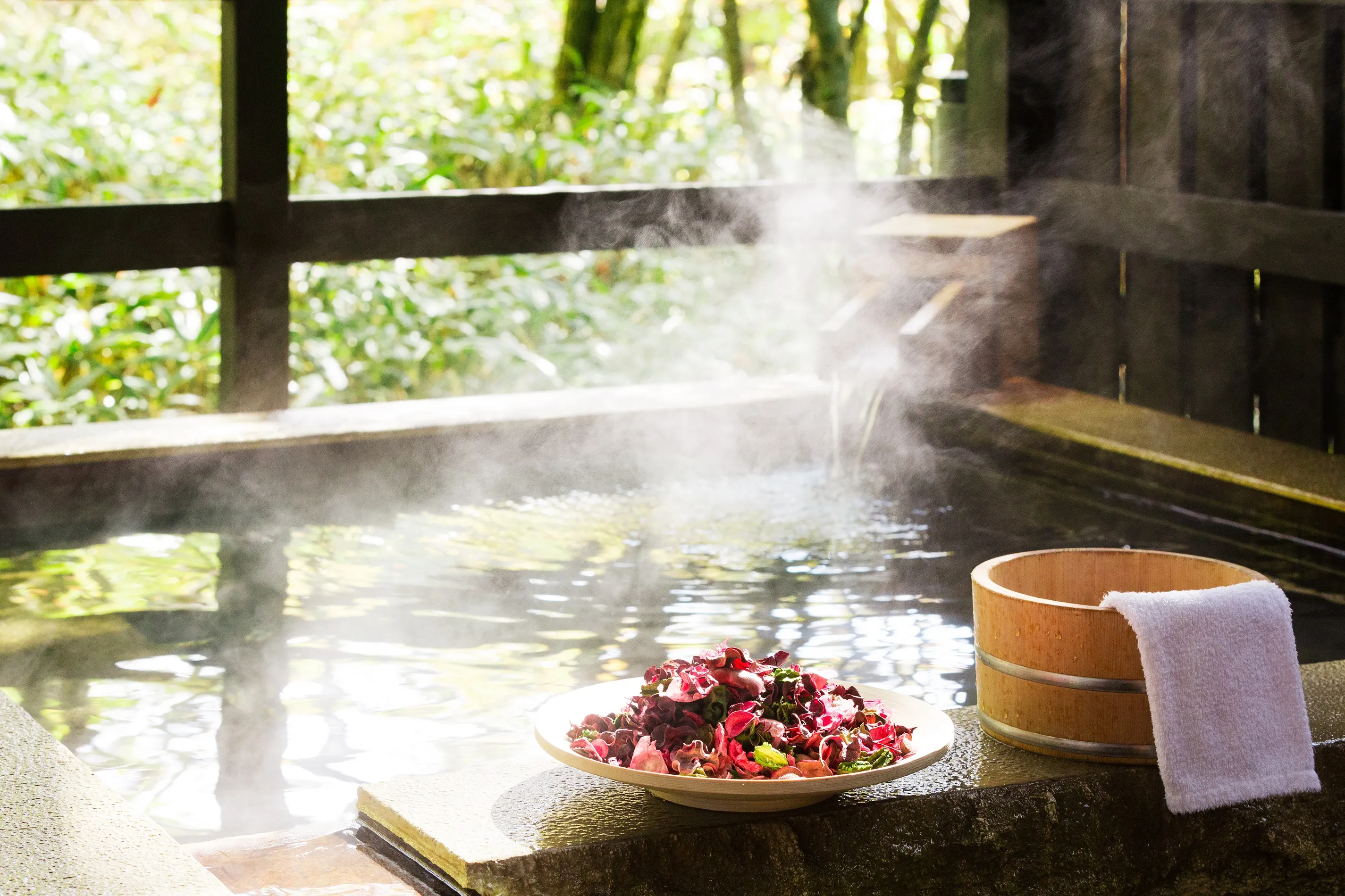 界 阿蘇では母娘水入らずでゆっくり語らえるよう、「阿蘇ハーブ花風呂」を提供します。阿蘇地方は澄んだ空気ときれいな水でハーブづくりが盛んな土地柄です。森にせり出すように配置された客室露天風呂に、カモミールやレモングラスなどのハーブとバラやガーベラなど春の花々を浮かべます。入浴後には、ローズティなどの花茶と、肌の保湿力を高めるヨーグルトパックも用意します。