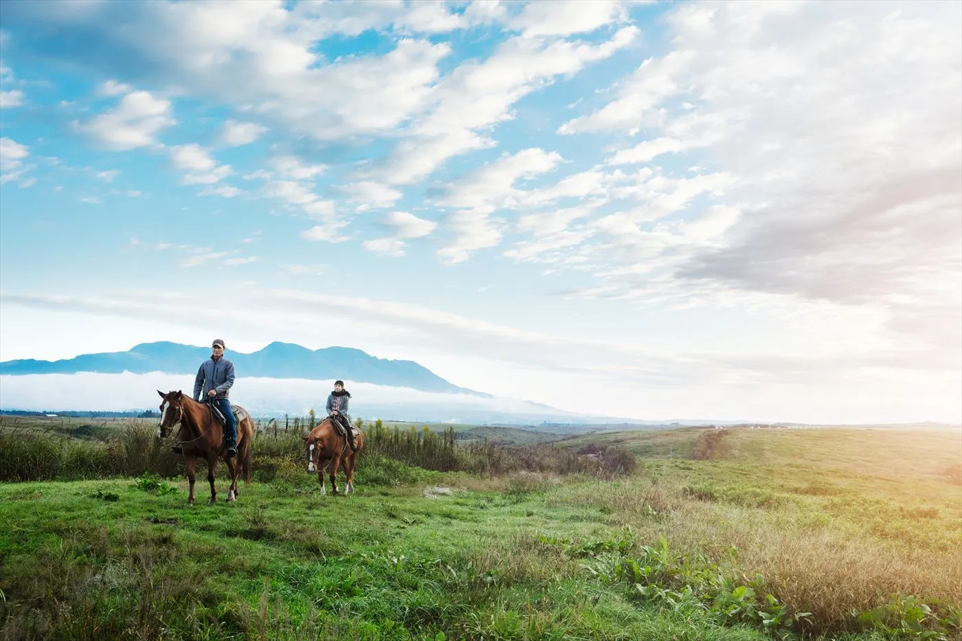 朝は広大な草原で朝日を眺める「朝焼け乗馬」がおすすめです。朝露に濡れる美しい新緑、澄んだ空気、そして馬上から見る朝日に染まる空と眼前に広がる阿蘇五岳は宿泊するからこそ、目にすることができる絶景です。乗馬後は、併設のカフェにて飲み物を提供します。いつもと違う特別な体験で母娘の会話も弾みます。