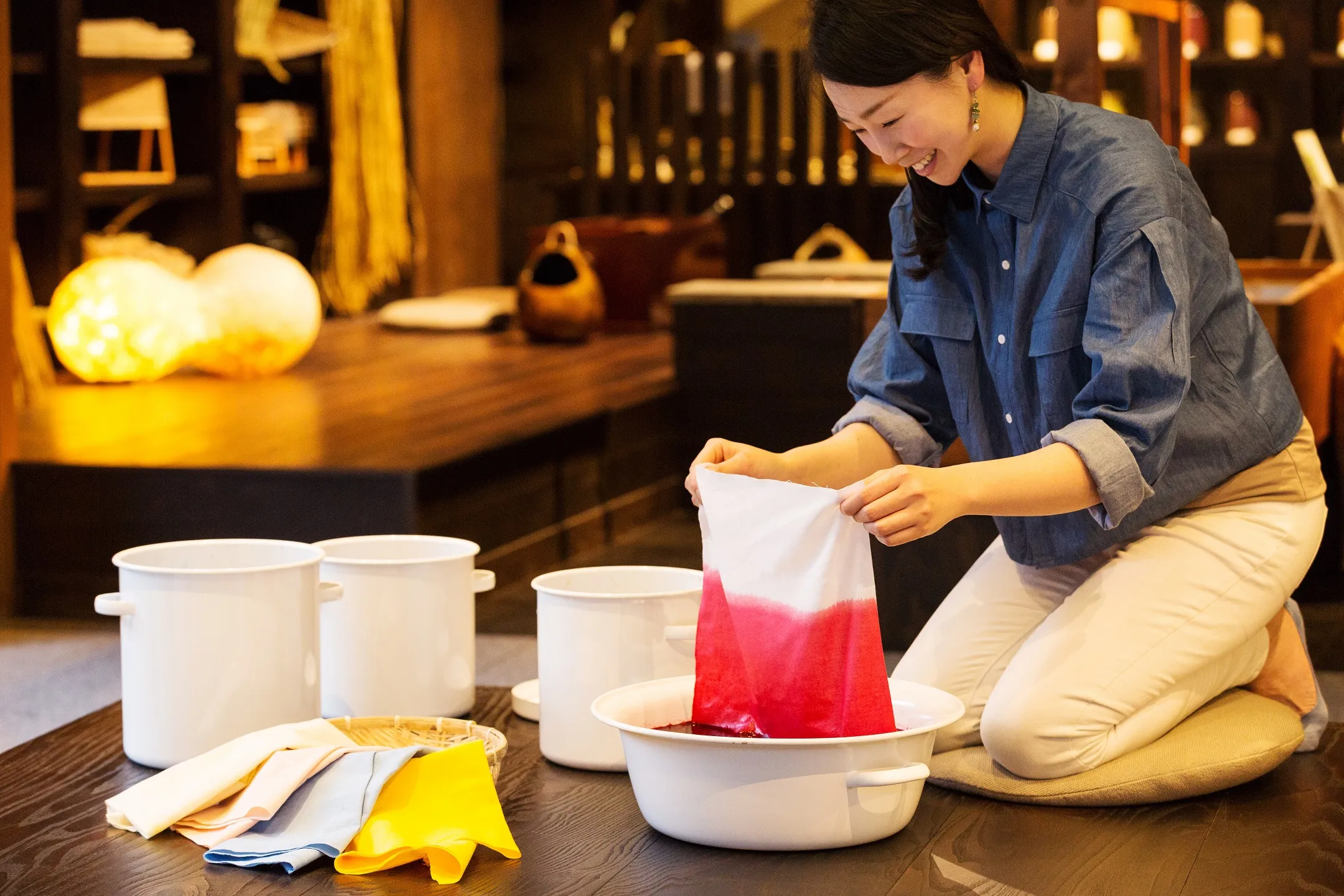 界 川治では栃木県足利市の伝統工芸、草木染めでランチョンマットを作ることができます。刈安、紫根など天然の植物染料を用いた草木染めは、落ち着いた風合いが特徴です。体験中の様子を撮影し、アルバムにして提供します。旅行後もランチョンマットを使うたびに、楽しい旅の思い出がよみがえります。
