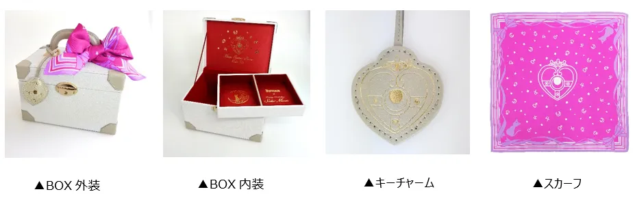 外側はラメの入ったホワイトに、角はシャンパンゴールドでアクセントをつけています。蓋を開けると、ワインレッドの生地に蓋裏には“コズミックハートコンパクト”のモチーフ、中仕切りには、ルナのイラストとバファリンコラボのロゴをゴールドの箔押しで上品にあしらい、女性の心をくすぐる、中まで可愛らしいデザインに。BOXは薬箱だけでなく、化粧品やアクセサリー入れなど多様に使えます。また、リボン風にあしらったスカーフをつけることで、セーラームーンらしさを更に演出しております。