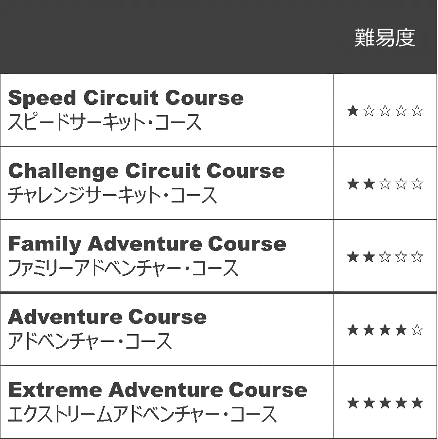 新たに増設するのは、10歳でも自分で運転して走破できる「ファミリーアドベンチャー・コース」、水たまりや丸太など様々な障害も出現する「チャレンジサーキット・コース」、そして、森の木々の間、道なき道を突き進む、上級者も興奮感動まちがいなしの「エクストリームアドベンチャー・コース」の3コース。すでに好評をいただいている初心者向け「スピードサーキット・コース」と「アドベンチャー・コース」と併せて計5コースでお客様をお迎えいたします。これにともないキャパシティも増強、幅広い年齢層の方、そして、より多くの方に、本能を揺さぶる体験を楽しんでいただけるようにいたしました。
