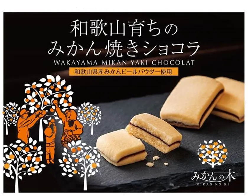 和歌山県産のみかんピールパウダーをたっぷり練り込みじっくり焼き上げた、みかんの風味広がる焼きショコラです。中に挟まれたチョコレートがアクセントとなっています。パッケージはみかん農家さんの収穫の様子を描き、和歌山県の雰囲気を残しながらも、黒を基調とした高級感のあるこだわりのパッケージとなっています。焼きショコラなので夏場でも溶ける心配が無く、お土産にぴったりのお菓子です。