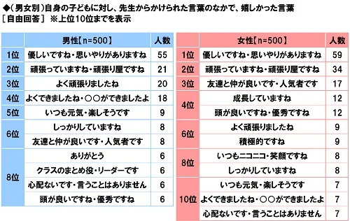 そこで、全回答者(1,000名)に、自身の子どもに対し、先生からかけられた言葉のなかで、嬉しかった言葉は何か聞いたところ、1位は「優しいですね・思いやりがありますね」(114人)、2位「頑張っていますね・頑張り屋ですね」(55人)、3位「よく頑張りましたね」(29人)となりました。自身の子どもが幼稚園・保育園や小学校で優しさや思いやりを持って行動しているということを聞いて、何より嬉しいと感じる親が多いようです。また、子どもの頑張りを先生に認めてもらえることにも喜びを感じる親が多い結果となりました。