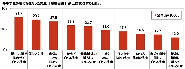 全回答者(1,000名)に、自身が小学生の頃に好きだったのは、どのような先生かを聞いたところ、「面白い話で笑わせてくれる先生」が31.7%で最も高くなりました。笑わせて楽しませてくれる先生に魅力を感じていた人が多いようです。次いで、「優しい先生」(29.2%)、「自分のことを認めてくれる先生」(27.6%)となりました。