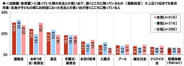 男女で比較すると、女性では、「運動会・体育祭」(男性31.0%、女性38.8%)や「合唱コンクール・音楽会」(男性10.3%、女性16.1%)が男性と比べて高い傾向がありました。一生懸命練習を重ねて本番を迎えるという活動のなかで、先生と過ごした時間が印象深い思い出となっているのではないでしょうか。