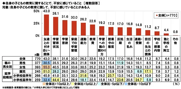 男女別にみると、男性では「学習習得状況」(35.5%)、女性では「友達との付き合い・関係」(55.0%)が最も高くなりました。パパが最も気になるのは学習面、ママが最も気になるのは友人関係ということがわかりました。
