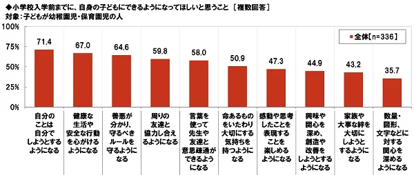 幼稚園児・保育園児の親(336名)に、小学校入学前までに、自身の子どもにできるようになってほしいと思うことを聞いたところ、「自分のことは自分でしようとするようになる」が71.4%で最も高くなり、次いで、「健康な生活や安全な行動を心がけるようになる」(67.0%)、「善悪が分かり、守るべきルールを守るようになる」(64.6%)となりました。先生や親に頼ってばかりではなく、自立心を持ってほしいと考える親が多いことがわかりました。以降、「周りの友達と協力し合えるようになる」(59.8%)、「言葉を使って先生や友達と意思疎通ができるようになる」(58.0%)が続きました。コミュニケーション能力について、子どもの成長を期待している親が多いようです。